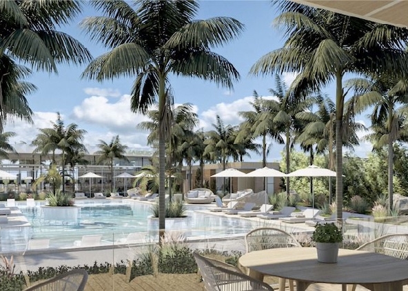 Swimming pools, restaurant, sports bar, spa, outdoor cinema, mini-golf, sports courts, and family areas overlooking the lake.
